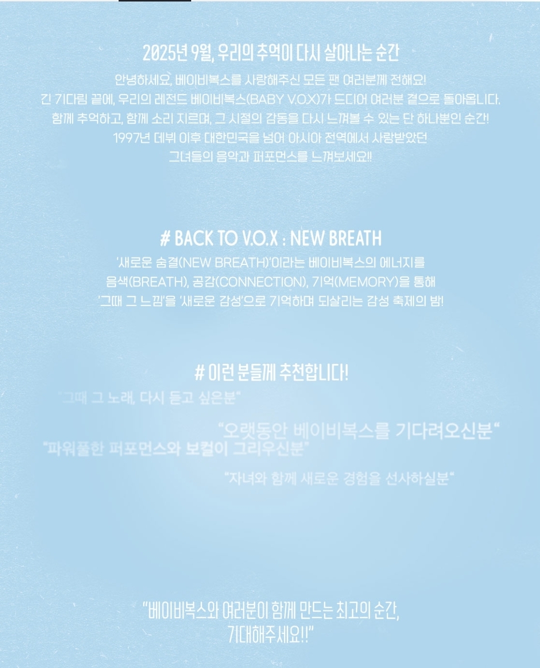 ‘BACK to V.O.X: New Breath’는 단순한 회상이나 복고 콘셉트에 그치지 않는다. 포스터에서부터 콘서트 타이틀, 부제까지 모두 ‘새로운 시작’을 향한 뚜렷한 방향성을 드러내고 있다.