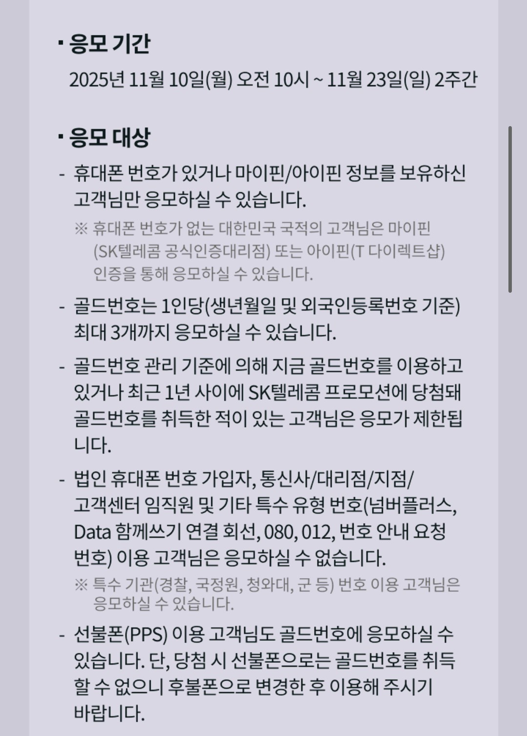 골드번호는 타인에게 양도할 수 없으며, 골드번호를 이미 사용 중이거나 최근 1년 사이에 골드번호 취득 이력이 있는 고객은 응모할 수 없다. 2025년 골드번호 프로모션과 관련한 자세한 내용은 T다이렉트샵에서 확인할 수 있다