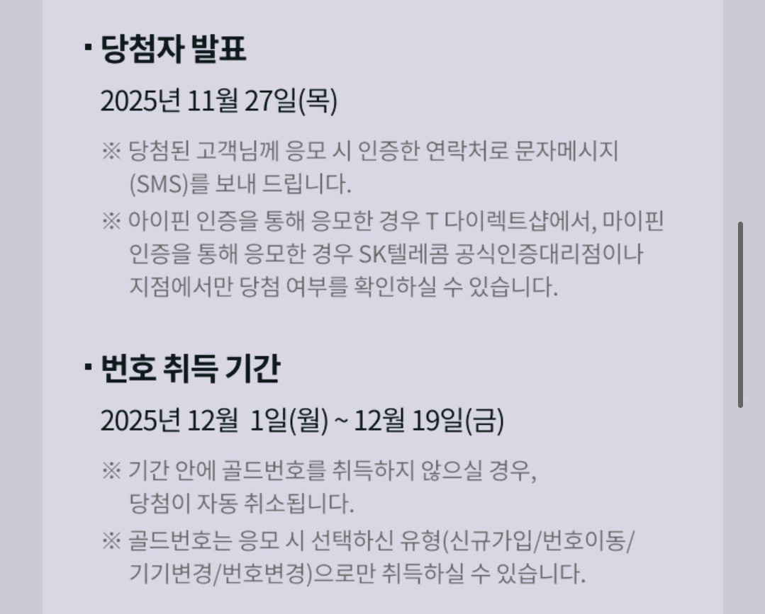당첨자에게는 개별 안내사항을 담은 문자메시지가 발송되며, 당첨된 번호를 사용하기 위해서는 12월1일부터 12월19일 사이에 SK텔레콤 공식 인증 대리점과 T다이렉트샵에서 등록해야 한다.